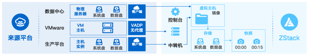 ZSphere支持VMware环境无代理复制,通过中转机制从VMware VADP接口复制出虚拟机,并将生产平台的实例和数据中心的物理服务器的系统盘、数据盘进行镜像、存储和快照,进而在业务零中断的情况下实现热迁移。