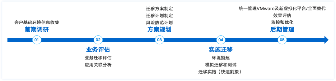 企业用户在实现对VMware的替代时,必然需要考虑迁移过程,即将现有业务从VMware环境迁移到新平台。迁移项目的首要关注点是如何实现“无感”的稳定切换,即“无缝迁移”。然而,VMware迁移远不止于迁移操作本身,通常需要在整体规划的基础上,分步骤、分业务逐步推进,因此,企业用户真正的需求是“无忧迁移”。