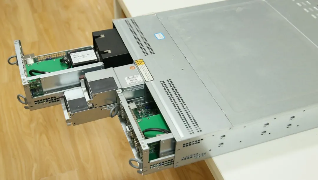 图注:将ZStack Mini的两个节点及电源模块抽出,可以看到均是独立组件设计。两个服务器节点内置在一台2U机箱内,构成一套“微型”系统,或曰完整解决方案;通过虚拟化技术来承载不同的应用,实现应用整合,2节点设计保证高可用