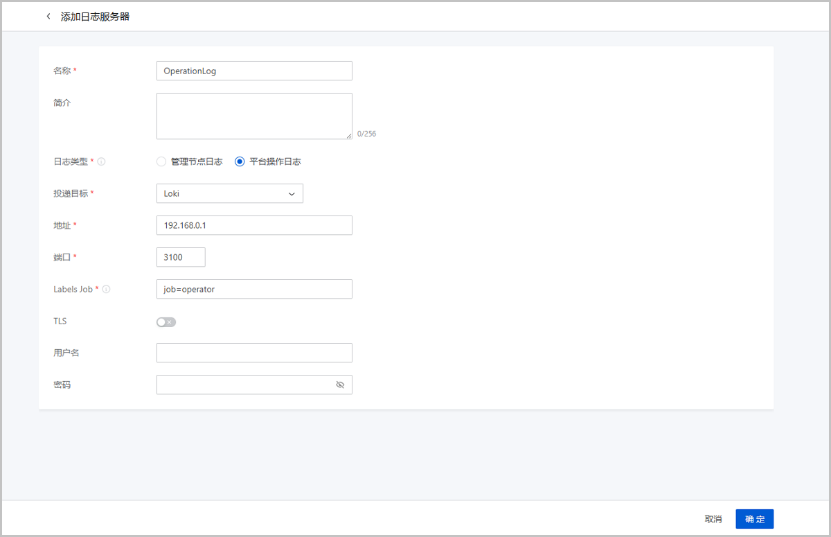 ZStack Cloud 5.3.28开始,支持添加专用于接收平台操作日志的日志服务器,支持多种服务器类型,包括Syslog、Elasticsearch、Forward、Kafka、Loki。