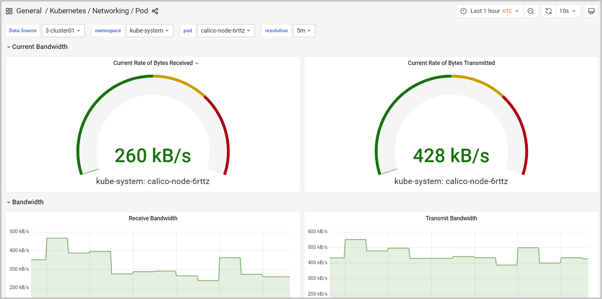 进入Kubernetes / Networking / Pod监控面板,可查看单个容器组网络资源使用情况。