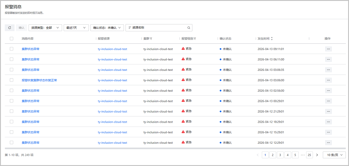 该页面集中展示所有报警消息和报警恢复消息,包括报警消息的消息内容、报警资源、报警级别、确认状态、发生时间等。